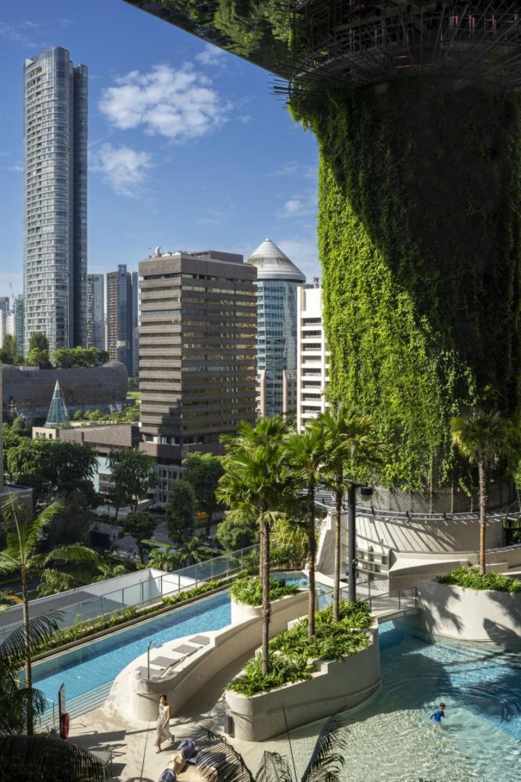 WOHA 建築事務打造的不只是拔地而起的量體,而是可持續性的綠色建築,巧妙地將「水景」與「花園」融入建築中,實現超過 300% 的綠地容積率。除了精湛的外觀設計,客房的設計也十分講究,為住客提供奢華的住宿體驗。在去年開幕後,深受全球旅人的喜愛,獲得 2024 全球最佳高層建築獎。