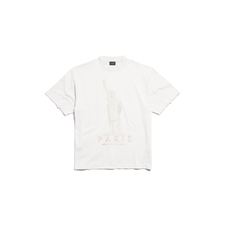 Balenciaga 的設計總是充滿顛覆性,即便是最簡單的白 T-shirt 也不例外。Oversized 的剪裁搭配刻意做舊的破損設計,讓整體造型充滿狂放的街頭感。上衣正面印有褪色效果的「自由女神像」,瞬間賦予簡約設計強烈的視覺衝擊力,展現了前衛與街頭的完美平衡,適合酷酷風格的潮流男女。(商品售價 NT$ 28,000元)