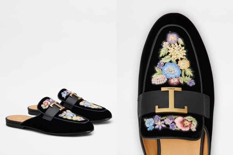 Tod’s 始終堅持在經典款式中注入現代元素,創造出兼具功能性與時尚感的作品。這雙 T Timeless 穆勒鞋是與 Rahul Mishra 的限量聯名款,鞋履設計延續了品牌經典的橡膠豆豆鞋底,並以柔軟的天鵝絨拼接皮革製成,鞋面上飾有閃鑽、珠片和串珠刺繡的花朵圖案,搭配上標誌性金屬 T 扣,展現出華麗與優雅並存的古典氛圍,簡單搭配一件 T-shirt 牛仔褲就很有韻味。(商品售價約 NT$ 41,000元)