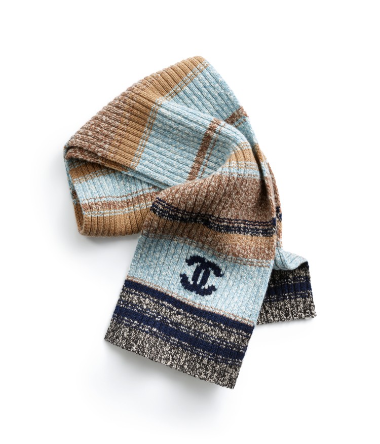 這條注入淡藍色系的圍巾,與近奶茶色的棕色形成平衡的色彩,品牌標誌性的 C Logo 則以海軍藍呈現,整體中性的設計男生戴也很適合。(商品售價:NTD52,500)