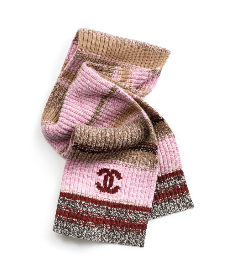 冬日必備的圍巾 Chanel 選擇以棕色及粉色做交織呈現,整體柔和宛如甜點的配色,展現女孩可愛活潑的樣貌。(商品售價:NTD52,500)