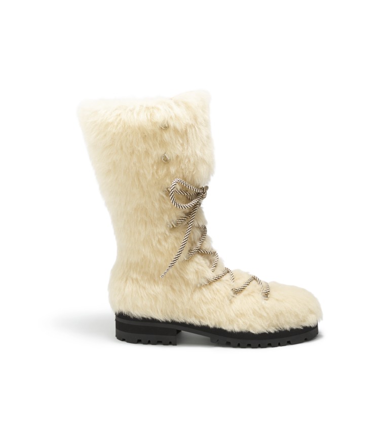 這款長靴運用白色絨毛為主要面料,搭配上輪胎底的設計,讓整體擁有一絲率性的氣息,鞋帶的配色則呼應本季暖色系的主軸,以充滿織紋的材質呈現。(價格店洽)