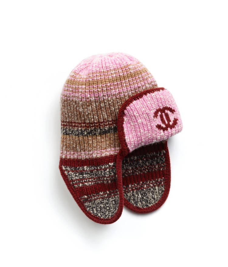 毛帽是冬天的必敗單品,這款帽子運用米色、粉色及酒紅色,勾勒出暖色調為主軸的包款,可包覆耳朵的設計,不僅增添造型還很保暖。(商品售價:NTD28,200)