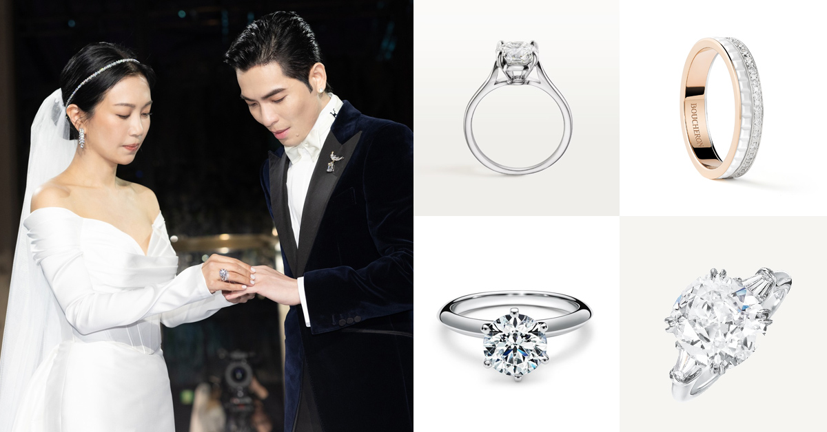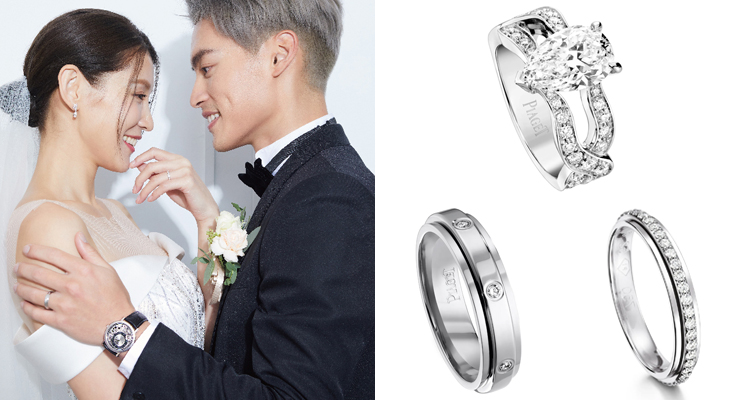 被稱為「雙孟CP」的許孟哲與名模趙孟姿,當年在婚禮及儀式上,分別配戴來自於伯爵(Piaget)的「Jardin Secret」系列鉑金鑽戒(右上),以及「Possession」系列的對戒(右下)。透過兩系列的浪漫靈感,傳達對雙方的愛情寓意。(婚戒價格依鑽石克拉數大小而訂)