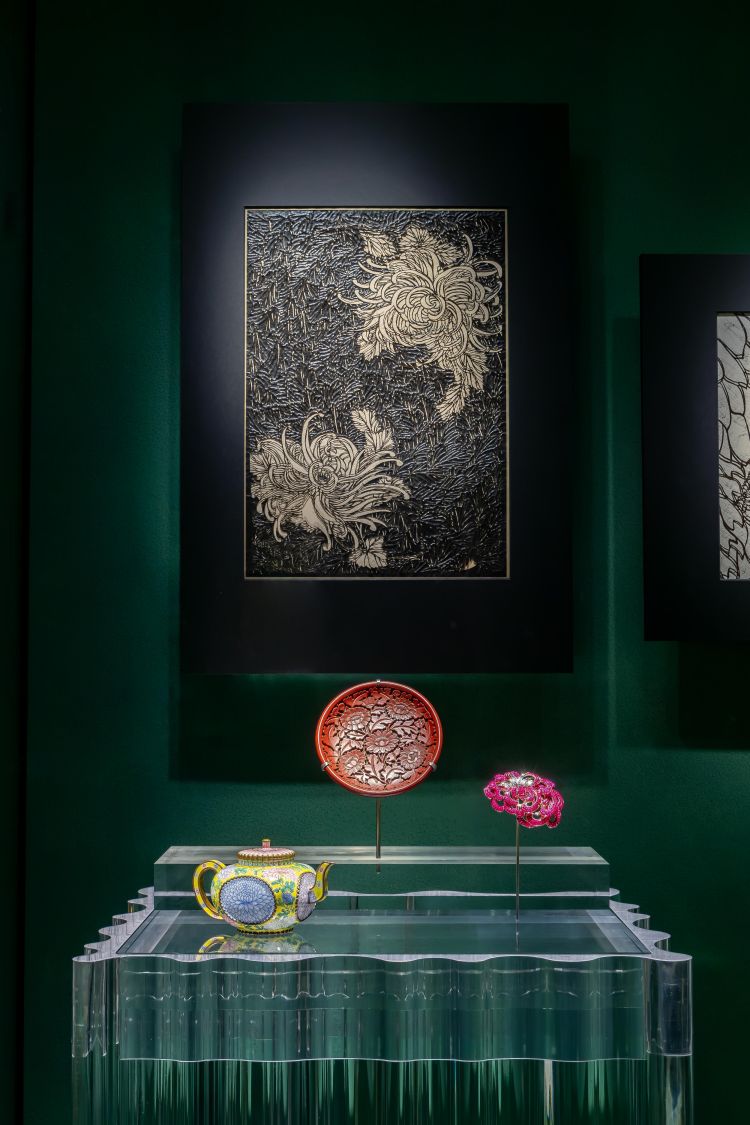 A:同樣地興奮與開心。但這次比較不一樣:我們攜手國立故宮博物院與巴黎裝飾藝術博物館,進行了「三方」聯展。其展名《大美不言》源於莊子名言:「天地有大美而不言。」我覺得這個概念真的很棒,美,有時候,是不需要過多的解釋。我深信:美自有其言。當你不知道怎麼轉譯、不知道如何表達的時候,其實你就不需要解釋了。只要靜靜地去體會與感受,就足夠了。好比你在展間,看見花卉造型的 Chrysanthemum 胸針,你能感受到「她」在跟你對話。雖然不知道怎麼形容,但感受真實存在著。