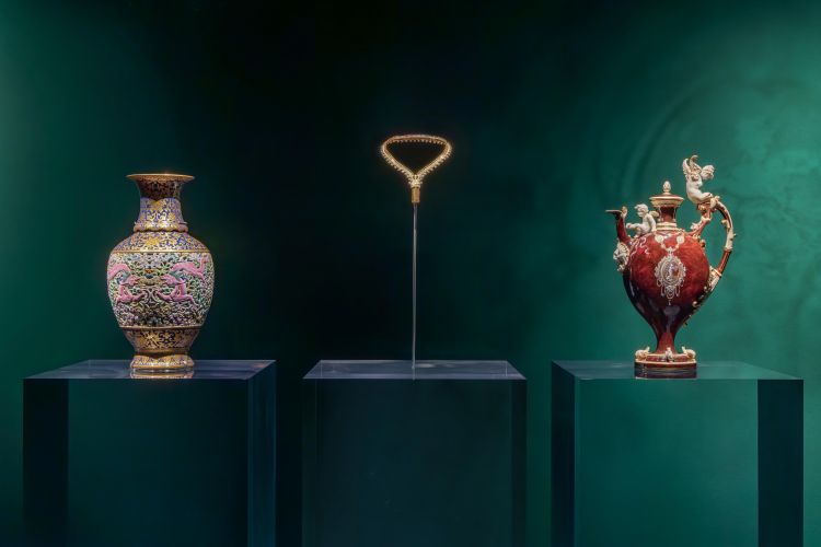 A:我希望大家能真正意識到:珠寶,亦是藝術品。我認為《大美不言》典藏精粹特展最迷人之處,在於三方展件於不同時代、不同地區,甚至在不同文化之間,皆有其耐人尋味的相似之處。在「自然萬物」主題展間裡,其中一個展櫃 呈現三個關於「孔雀」的作品,包括:故宮博物院的「琺瑯彩孔雀圖碗(1723 - 1735 年)」,巴黎裝飾藝術博物館的「孔雀花瓶(1900 年)」,以及梵克雅寶的「孔雀桌上煙盒(1950 年)」。雖然當時的創作者不認識彼此,卻擁有奇妙地相似靈感與興趣。