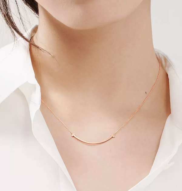 外型典雅的蒂芙尼(Tiffany)「T Smile」系列項鍊,自推出以來深受無數女孩們的喜愛,是品牌詢問度超高的單品。該系列一共有推出4種不同尺寸,每種尺寸都有再分成「鑲鑽」和「素色金」的2種版本,以18K黃金、18K白金、玫瑰金…等材質為主。配戴時,圓弧形鏈墜就宛如一抹迷人的微笑,輕巧地落在鎖骨處,十分迷人。