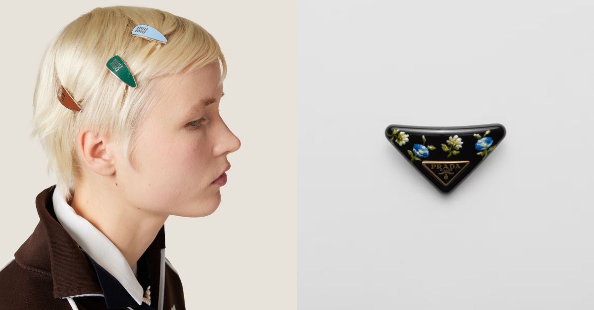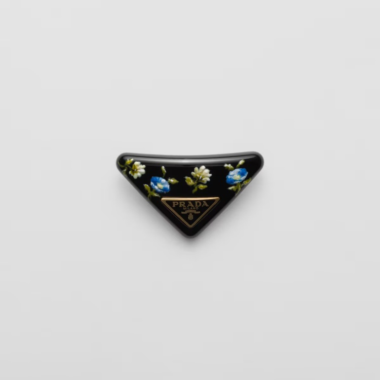 Prada 的髮夾設計以品牌代表性的三角 Logo 為主軸,並搭配上花朵圖案於其中,可愛又不失個性的設計,酷女孩也會被征服。(商品售價:NTD18,000)