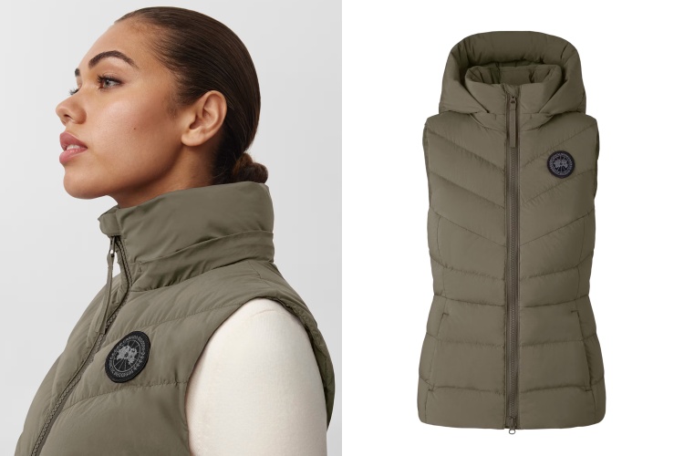 Canada Goose 的 Clair 系列背心,運用霧面軍綠色搭配標誌性黑標,散發出一種低調的奢華。這款背心通過精緻的絎縫工藝呈現出修身的輪廓,勾勒出穿著者的身形,同時保持溫暖。其外觀設計在簡約中蘊含了豐富質感,完美適合都市生活中既注重功能又不失格調的摩登女性。(商品售價約 NT$ 25,700元)