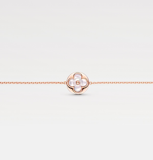 珠寶創意總監Francesca Amfitheatrof擷取靈感創作的「Colour Blossom」珠寶系列,充分展現出路易威登(Louis Vuitton)品牌於1896年創作至今的經典Monogram花卉美姿。此條手鍊,則是將雕琢成花卉盛放形狀的白色珍珠母貝鑲嵌於玫瑰金的鑲座內,低調展顯出那微妙的虹彩光澤。