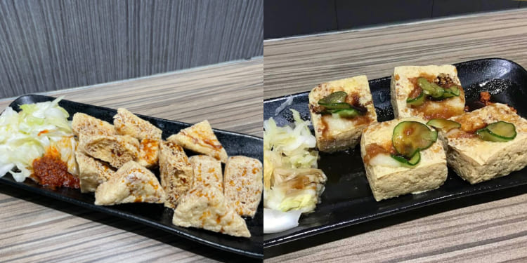 接著就是重頭戲酥炸臭豆腐啦!共有三角形的台式臭豆腐跟四方形的港式臭豆腐兩種,John 編覺得他們的臭豆腐炸的真好,不但外酥內嫩,冷掉也不會有油味,如果是第一次來的朋友真的必須點港式臭豆腐,豆腐中間戳洞並且加入醃製過的小黃瓜片,在加入特製蒜醬,一口吃下真的超滿足,但是也因為家了小黃瓜跟泡菜,吃起來非常解膩,如果敢吃辣的也推薦一定要加速店家特製的麻辣醬,吃起來層次更豐富。