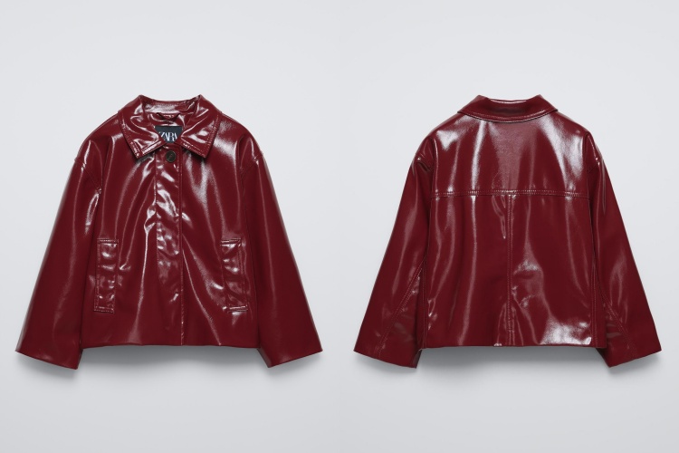 勃根地酒紅的漆皮外套充滿了強烈的視覺衝擊,搭配襯衫領和正面鈕扣閉合設計,營造出不容忽視的復古時尚感。亮面的仿皮面料,讓這款外套在陽光下閃耀著細膩光澤,猶如一件藝術品般吸引目光,非常適合前衛大膽的摩登酷女孩。(商品售價 NT$ 1,990元)