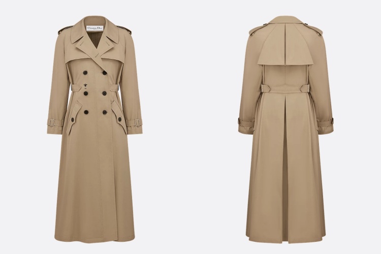 Dior 的經典卡其風衣以高雅的法式風格脫穎而出,米色棉質的溫潤質感與標誌性的「蜜蜂刺繡」相得益彰。這款風衣特別注重細節,設計了可調式腰部和袖口,使穿著者的身型更顯修長。對比色縫線和尖角口袋,為整體造型增添了更多細節度與精緻感,使得這件風衣無論是搭配日常穿搭或是正式裝束,皆能呈現優雅的時尚品味,非常適合獨立自主的都會女性。(商品售價 NT$ 155,000元)