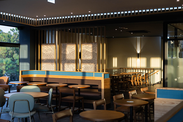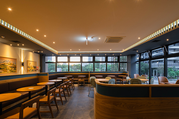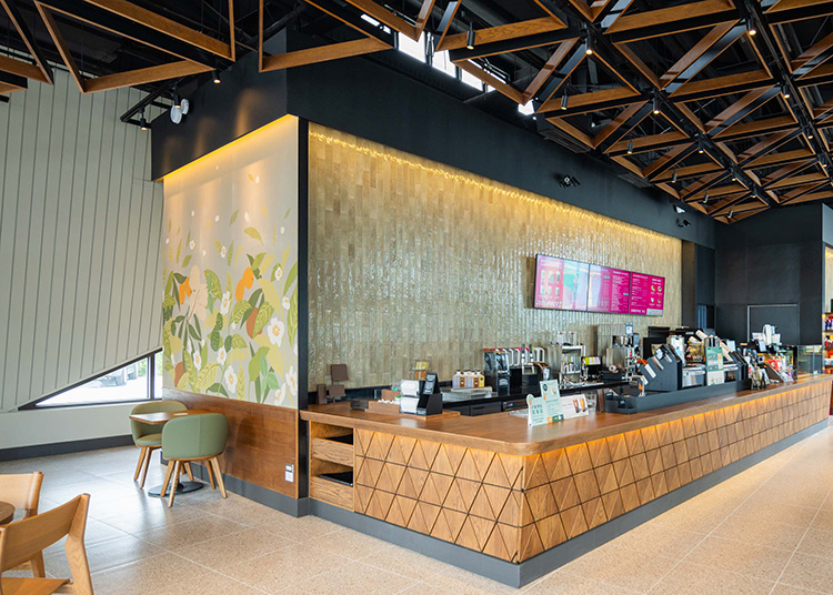 走進店內,木質裝潢的延伸與線條優雅的間接照明相得益彰,營造出和諧舒適的氛圍。牆上鮮豔的自然風景壁畫仿若為空間注入生機,使人不自覺地放鬆心情。這裡彷彿成為當地居民及來往旅客的避風港,一杯香濃的咖啡、一個安靜的角落,為每個人提供了一片心靈的綠洲。限量周邊商品以致敬門市對面的水圳森林公園,使用了立體感十足的蓬鬆毛巾繡工藝,為置身於科技城市的顧客帶來一絲自在悠閒的氛圍,彷彿將森林公園的一角隨身攜帶,隨時擁有屬於自己的寧靜綠洲。