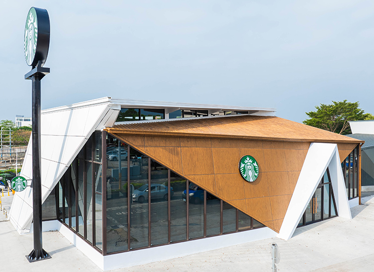 星巴克在斗南鎮的首家門市「雲林斗南門市」正式開幕,以別具特色的設計讓人眼前一亮。這家門市的設計靈感來自斗南的古名「他里霧」,象徵著無邊無際的草原,把大自然的悠遠和開闊巧妙地融入了現代的建築之中。外牆如同摺紙般的方形結構層層堆疊,彷彿一架靜靜停靠的紙飛機,木紋的溫暖色調與潔白的三角牆面和白色屋頂形成對比,視覺效果既醒目又和諧。