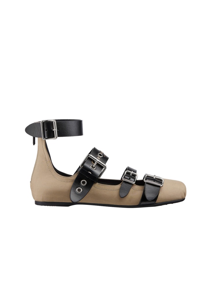 Punk Ballerina米色布料拼接黑色小牛皮繫帶芭蕾舞鞋