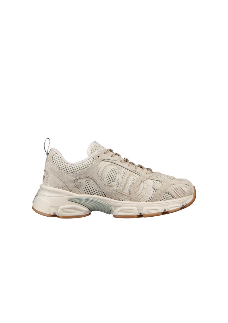 Dior Chrono 運動鞋是在優雅與功能之間,米色織網與同色系麂面小牛皮的搭配,側面的CD標誌、鞋舌上的幸運星徽章、以及後側的Dior標誌,讓這款運動球鞋為休閒造型增添穿搭亮點!(價格:NT$36,000)