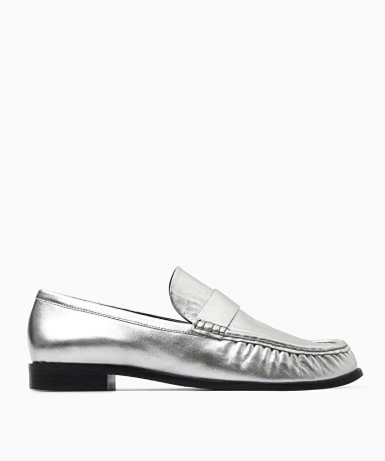 這款來自 COS 的皮革樂福鞋是對經典設計的全新詮釋,融合了柔軟皮革與當季流行的金屬銀色調,低調卻不失質感。採用優雅的杏仁形鞋頭搭配層疊式低跟,處處體現精緻細節,也相當適合上班族的正裝搭配。(商品價格約 NT$5,600元)
