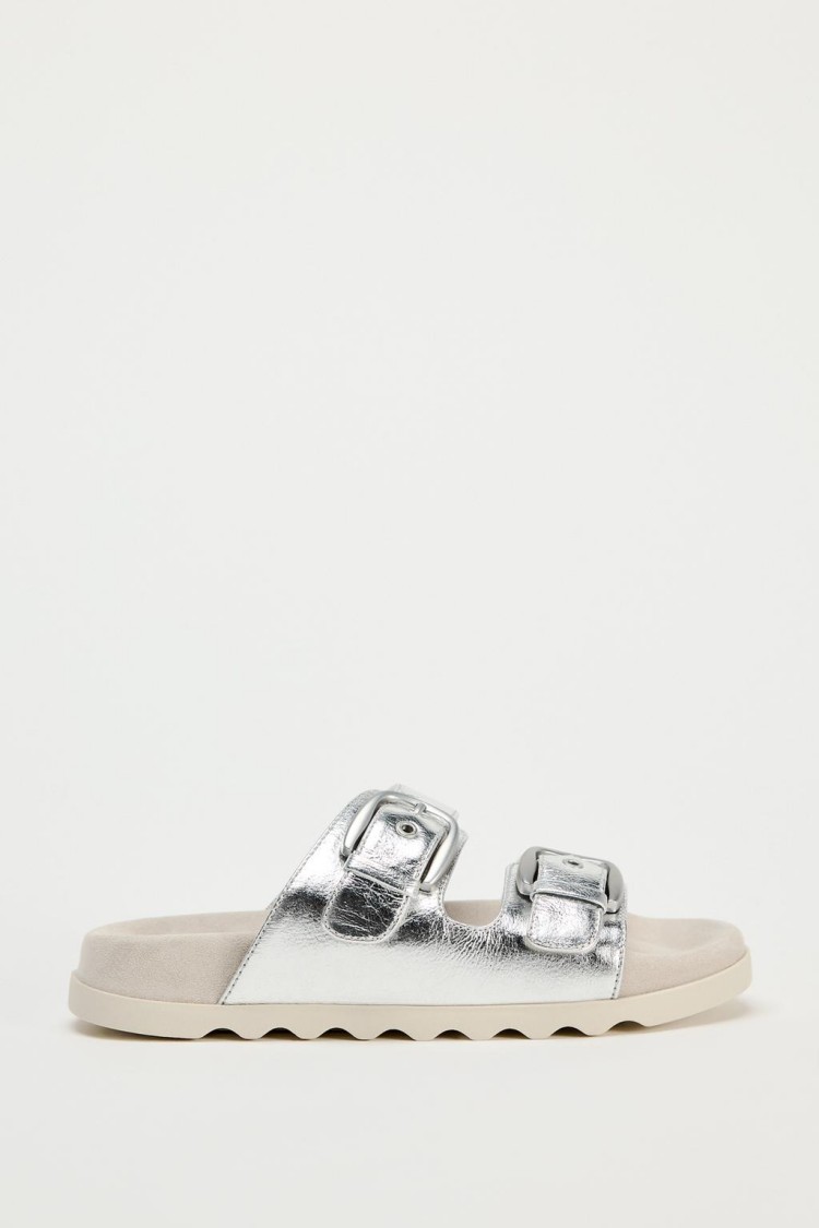 平底涼鞋配襪子是許多時髦女子的心頭好,為日常穿搭增添個性和新鮮感。Zara 推出這款銀色平底涼鞋正好契合這一潮流,不僅在設計上加入了毛料鞋底,提升了長時間穿著的舒適度,同時也使整體風格更顯細致。(商品價格 NT$ 1,490元)