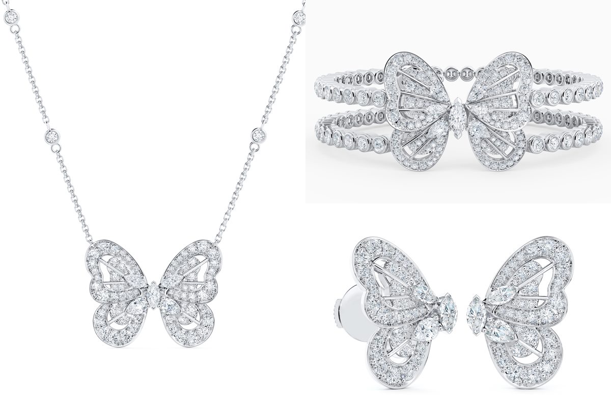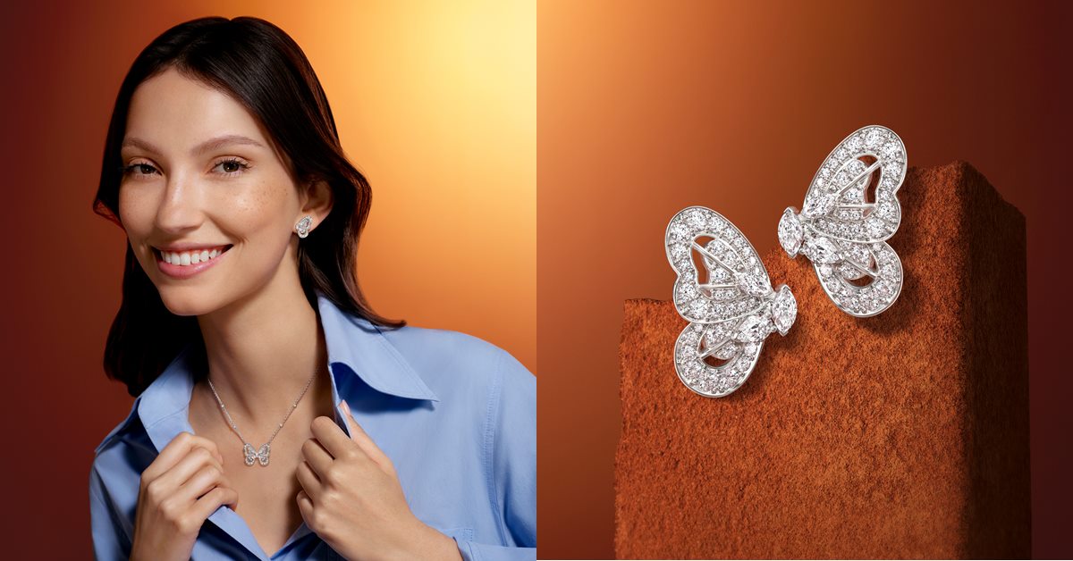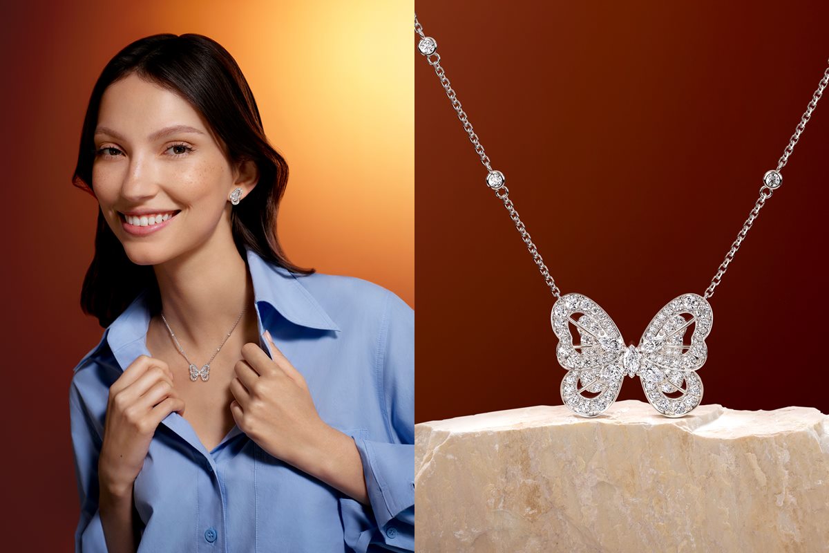 具有活躍生命力的Portraits of Nature系列,優美的蝴蝶輪廓,左右兩邊襯上由工匠精心打造的鏤空翅膀,藏不住的熠熠光芒,吸引眾人目光。此系列本季新增了三款佳作:butterfly鑽石手鍊將蝴蝶漂浮於兩排包鑲鑽石間,其翅膀上飾有欖尖形切割、梨形和圓形明亮式切割美鑽;butterfly鑽石吊墜項鍊除了以鑽石點亮鏤空翅膀,更以四顆圓形明亮式切割鑽石點綴18K白金細鍊;butterfly鑽石耳環上以單邊翅膀點綴,為耀眼佳作中更添趣味性。翩翩起舞的蝴蝶駐足在頸間、手腕與耳邊,更襯托出佩戴者舉手投足間的無限魅力。