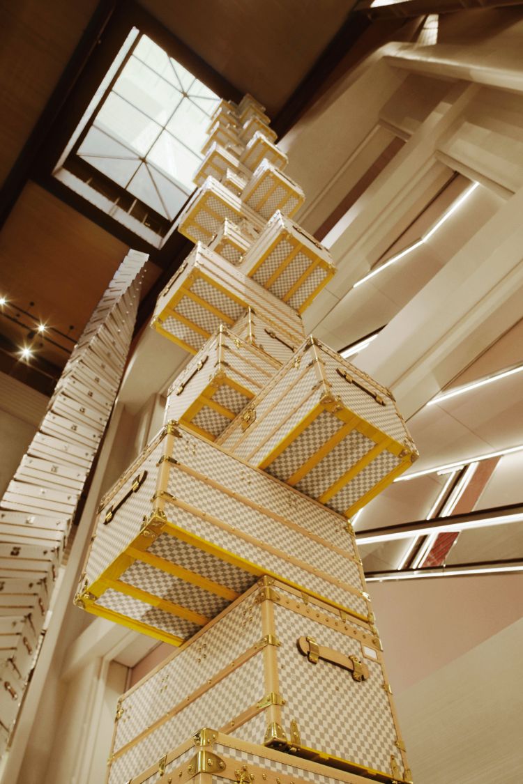 承襲百年行李箱品牌的脈絡,這座 LV 全新「臨時」零售空間最大的設計亮點,莫過於挑高中庭的裝置藝術設計,堆疊高達十六米的硬箱,由代表性 Courrier Lozine 90 硬箱組成,扭轉室內天際線,豐富空間層次性。裸露混凝土與木質地板交錯搭配柔軟的地毯,空間則根據開放式流動設計進行布局並以柔和的光線照明。