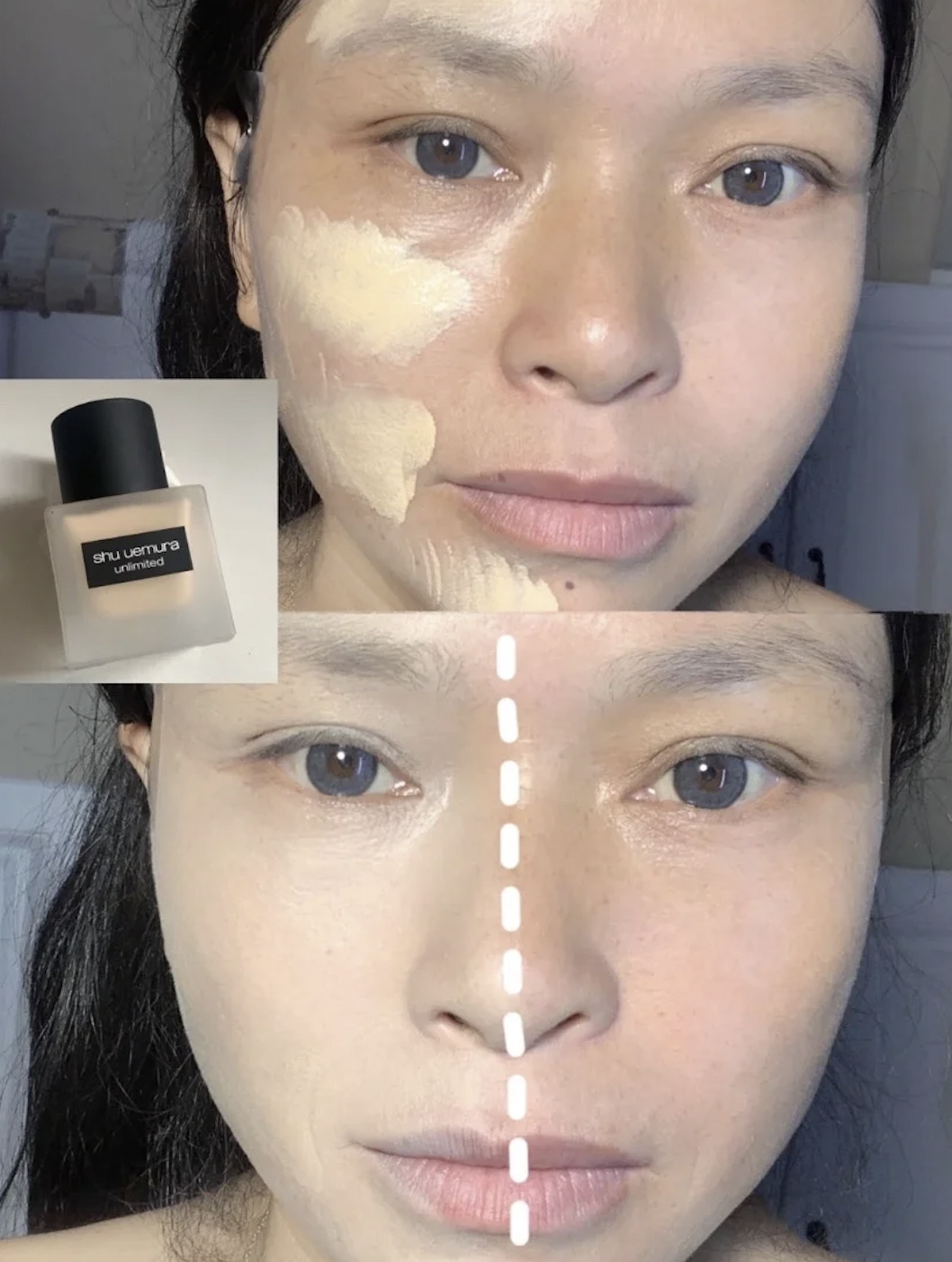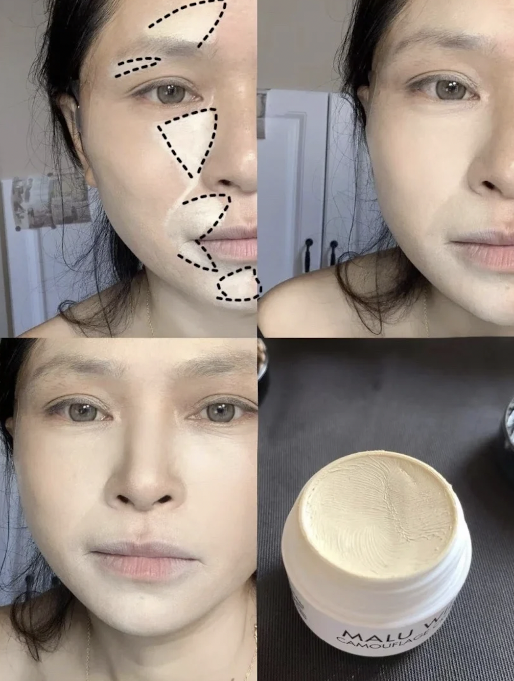 假如臉上很多斑點要遮,千萬不能把底妝上的太厚啊!不然那些細紋、痘痘可是會越來越明顯耶~化妝前可試著多多保濕,這樣就不會卡粉啦(歡呼)然後再使用質地輕薄且水潤的底妝膏「少量多次」全臉,色號可以選得更亮白一些~