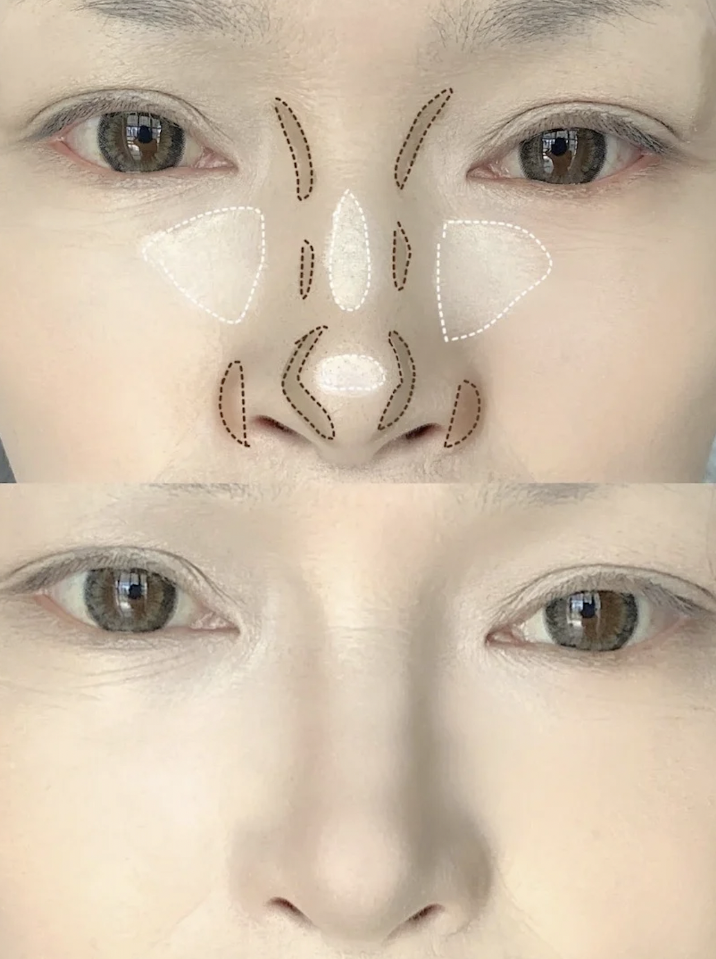有發現網美們的鼻子都小小的嗎?其實鼻翼較寬、鼻樑較塌,也會看起來稍有年紀的!女兒是先在鼻翼兩側、鼻頭兩側、鼻樑位置掃上灰棕色的陰影粉,這樣一來可以縮小鼻翼。再使用打亮筆或高光粉刷在鼻骨中間、鼻頭和進行提亮,整個立體感就跑出來了耶~