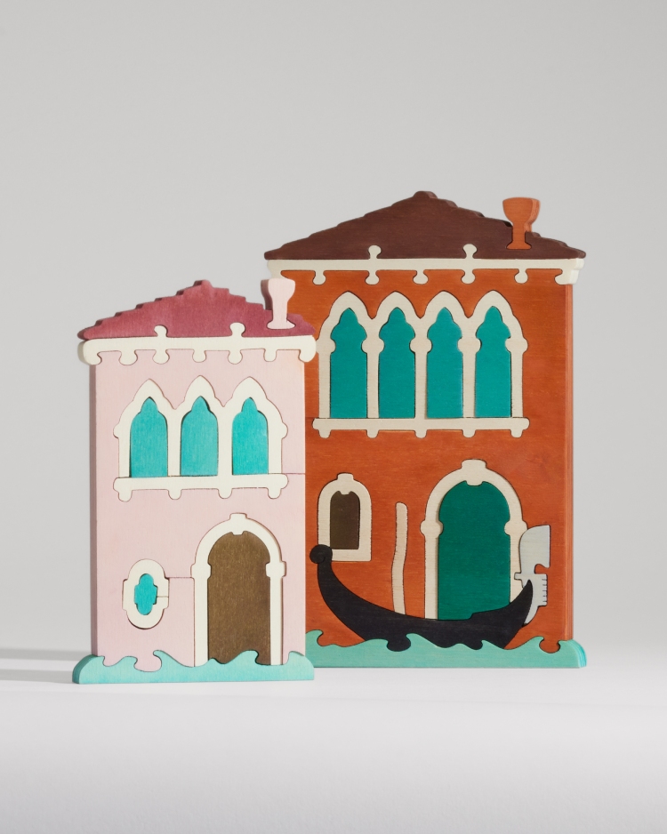 今年度參與「Bottega for Bottegas」的六間工坊,創立時間橫跨1868年至2017年,展現傳統工藝的深度與多樣性。首先,Signor Blum以木製拼圖以威尼斯典型建築為靈感,每一片拼圖都經手繪、裁切與上色,散發溫暖的手工魅力。擁有百年歷史的Fonderia Artistica Valese以鑄造技術創作出翼獅與貢多拉船頭裝飾,傳遞威尼斯的象徵語彙。而Modiano則帶來一副Trevigiane紙牌,是威尼托地區的經典遊戲工具。
