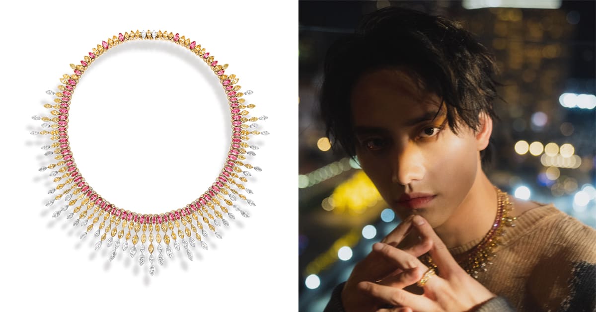 PIAGET伯爵風格大使范少勳若隱若現地前衛造型,襯出胸前由無數黃鑽與彩色寶石交織而成,細膩且獨特的項鍊。這件作品描繪了地中海的陽光映照海洋上,光影波光嶙峋輕輕湧向眼前,彷如凝視海平面遠端夕陽斜下暈染出的橘紅霞光,是一件優雅奢華的藝術傑作,搭配經典Possession系列玫瑰金戒指,成為派對中不可忽視的風格焦點。