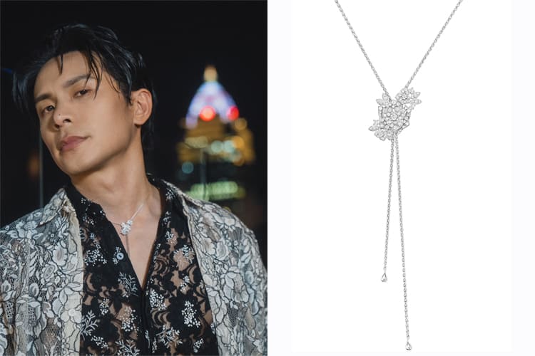 source: PIAGET伯爵,(左)新生代男星牧森配戴Possession系列18K白金鑽石流蘇長項鍊與Possession系列18K白金鑽石項鍊 /(右)Possession系列18K白金鑽石流蘇長項鍊