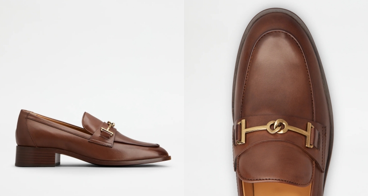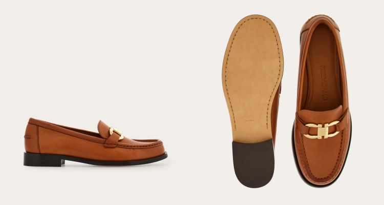 Ferragamo重新詮釋英式經典樂福鞋,鞋面牛皮經植物鞣製工藝處理,呈現自然的紋理與光澤,圓潤的鞋頭搭配褶飾與精緻明線縫製,鞋背則以標誌性的金色Gancio裝飾點綴,深受復古風格人士們的喜愛。(商品價格約 NT$ 34,800元)