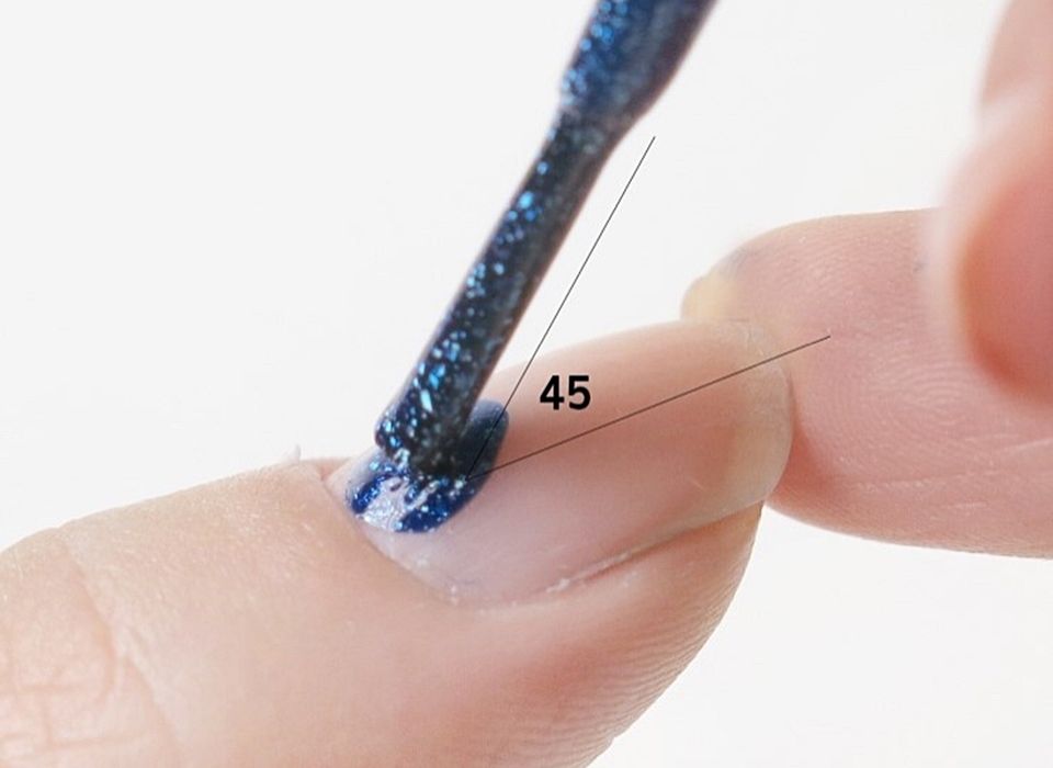 擦指甲油的時候,筆刷跟甲面的角度建議落在45度左右,可以讓指甲油更平均貼合甲面。