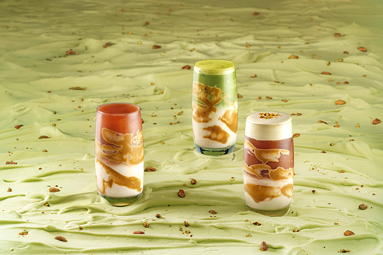 特!開心果鐵觀音鮮奶茶香緹,NTD120元。開心果鐵觀音鮮奶茶,NTD100元。開心果抹茶,NTD100元。