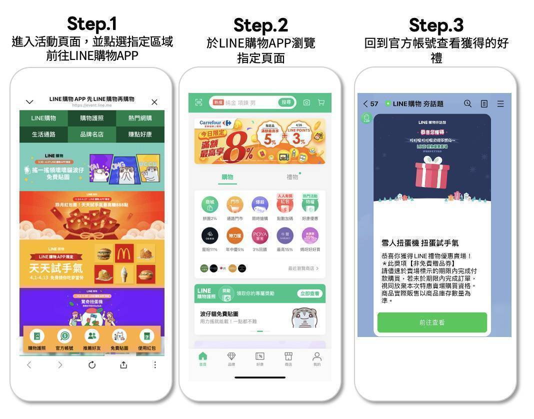 請務必同意下方個資告知事項再開始進行活動,如為封鎖「LINE 購物」官方帳號狀態即無法參加活動並喪失獲獎資格。 一、 活動期間 2025年1月1日(三)00:00 - 2025年1月31日(五)23:59。(台灣時間,下同) 二、活動流程 1. 於APP活動頁面找到並點選「LINE購物APP一月開一下,天天開啟領最高1000點紅包」曝光並前往APP指定頁面瀏覽,每天需完成瀏覽1個APP指定頁面。 |
