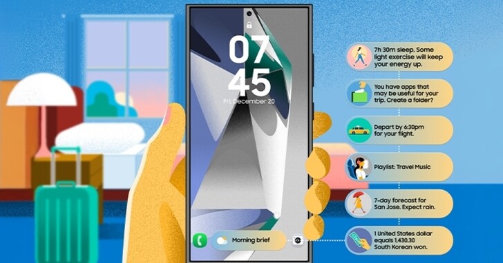 比方說,如果今天即將從韓國首爾飛往加州 San Jose 忙著打包行李,打包完成後,手機會提示使用者建立一個捷徑資料夾,放入所有的必要應用程式。透過此捷徑,就可以知道何時該前往機場以免錯過班機,也能為此趟旅程建立播放清單,為長途飛行營造舒心的氛圍。此外,只要滑動螢幕就能掌握當地天氣預報,不用在多個應用程式間切換搜尋,在整趟旅程中如果使用手機拍照錄影,於一天結束時還會引導回顧當日的美好片段。