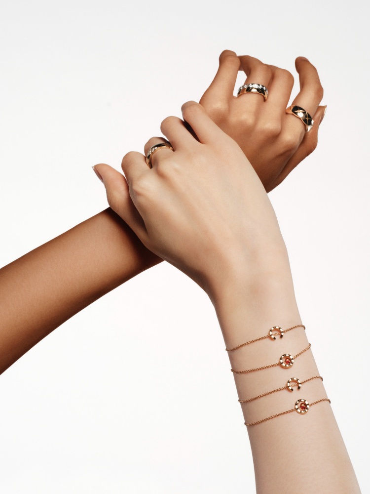 Chanel 的經典菱格紋元素起源於1955年推出的2.55包,該設計不僅成為品牌皮件的核心元素,也延伸至珠寶設計中。1993 年,Chanel推出的「Matelassé Perles」系列,是菱格紋首次從時尚走進珠寶的起點,而「Coco Crush」在2015年以當代、摩登的設計演繹經典的菱格紋,一舉成為品牌珠寶世界中的新經典,吸引著Z世代男女,是品牌持續暢銷並受歡迎的系列。