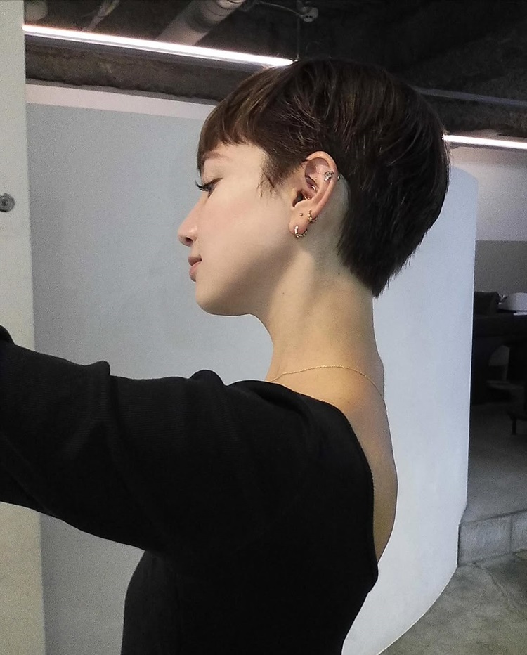 要展現五官優勢、顯小臉,極短髮的挑選可有著大學問!首先看到這款基礎款耳上齊瀏海短髮,透過上厚、下薄、保留鬢角與長瀏海等特點,達到修飾臉型、凸顯大眼的造型視覺效果。若害怕黑髮過於呆版,今年也很推薦以木質調色系漸層挑染,會更加顯氣色。
