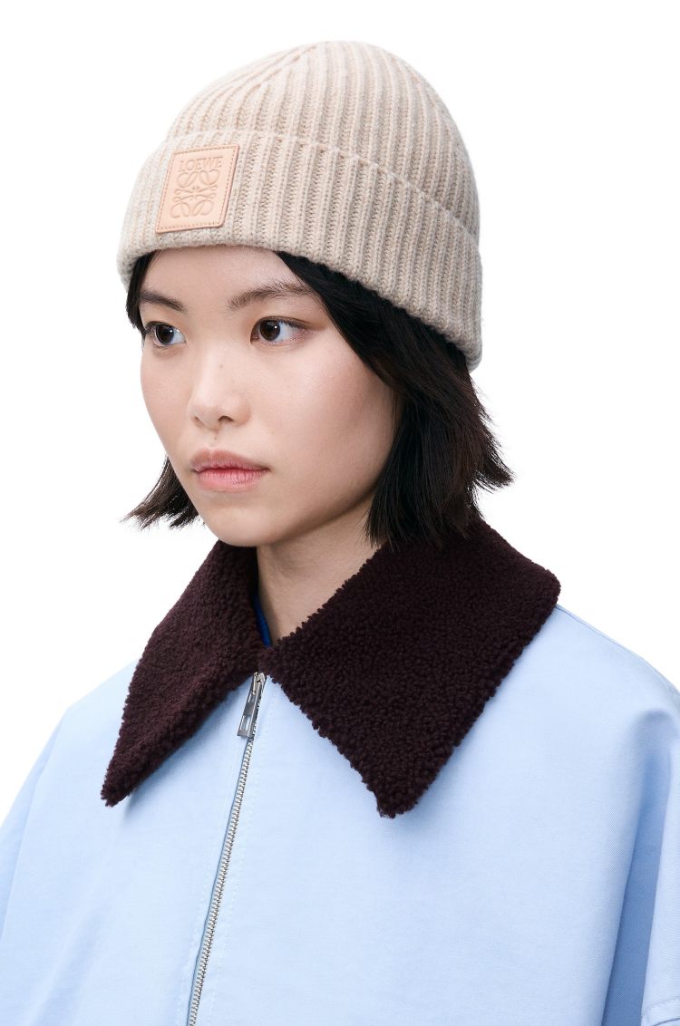 同樣是溫柔風格還有Loewe這款毛帽,設計上以淺米色羅紋針織搭配Loewe Anagram皮革飾片,百搭設計能融入日常風格,加上整體帽款長度較短,戴起來更顯俏皮活力!(價格:NTD 18,000 )