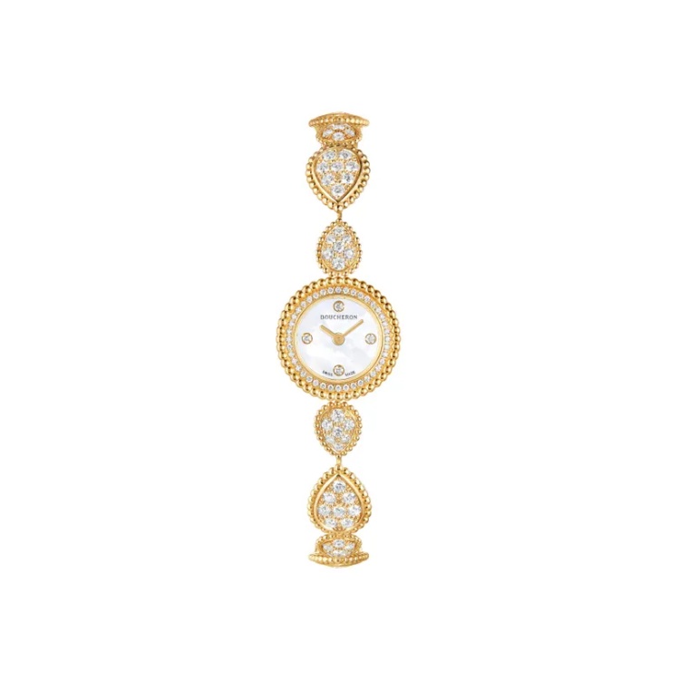 Boucheron 的 Serpent Bohème 系列腕錶以「水滴圖案」設計為特色,象徵自由與雅緻。18K黃金錶殼與柔軟錶鍊宛如流動的金色河流,點綴以鑽石與白色珍珠母貝錶盤,讓每一處細節都散發迷人光輝。錶練上的蜂巢鏤空設計使鑽石光芒倍增,錶盤四顆鑽石時標則如同夜空中緩慢移動的星辰。這款時計不僅是一件裝飾性腕錶,更是工匠藝術與創意設計的化身,錶殼上每一顆金珠的打磨,都蘊藏著無數心血與非凡技藝。(商品售價 NTD 1,730,000 )