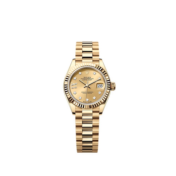 Rolex 的 Lady-Datejust 以其永恆經典的設計與卓越工藝,成為女性黃金腕錶的代表之作。18K黃金打造的28毫米錶殼,搭配品牌標誌性的「三角坑紋外圈」與鑲鑽香檳金色錶面,彷彿一場華麗的金色盛宴。香檳金錶面上的羅馬數字「IX」由8顆鑽石組成,閃爍著低調的奢華。元首型錶帶(President)精巧非凡,隱蔽連接組件的設計讓錶帶與錶殼渾然一體,如精雕細琢的藝術品。防水深度達100米的設計,讓這枚時計在華美之外更兼具實用性。勞力士專屬鑄造所對金屬的極致掌控,使得每一寸黃金都達到無可挑剔的純淨與質感。(商品售價 NTD 1,163,000)