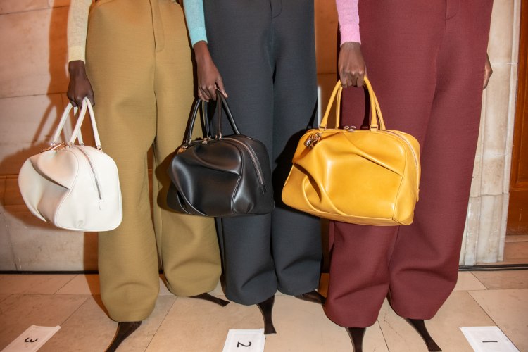 而在配件上線條極為誇張的鞋履成為焦點,鞋尖極長的跟鞋、後底翹頭的及膝靴、大圓頭粗跟鞋,加重了整體的造型感,同時也呼應服裝上誇張的大亮片、圓點、鈕扣等裝飾,包袋的設計則能看見比例失衡的口金包,以及抓皺的手提袋,在保持實用之餘又具造型感。