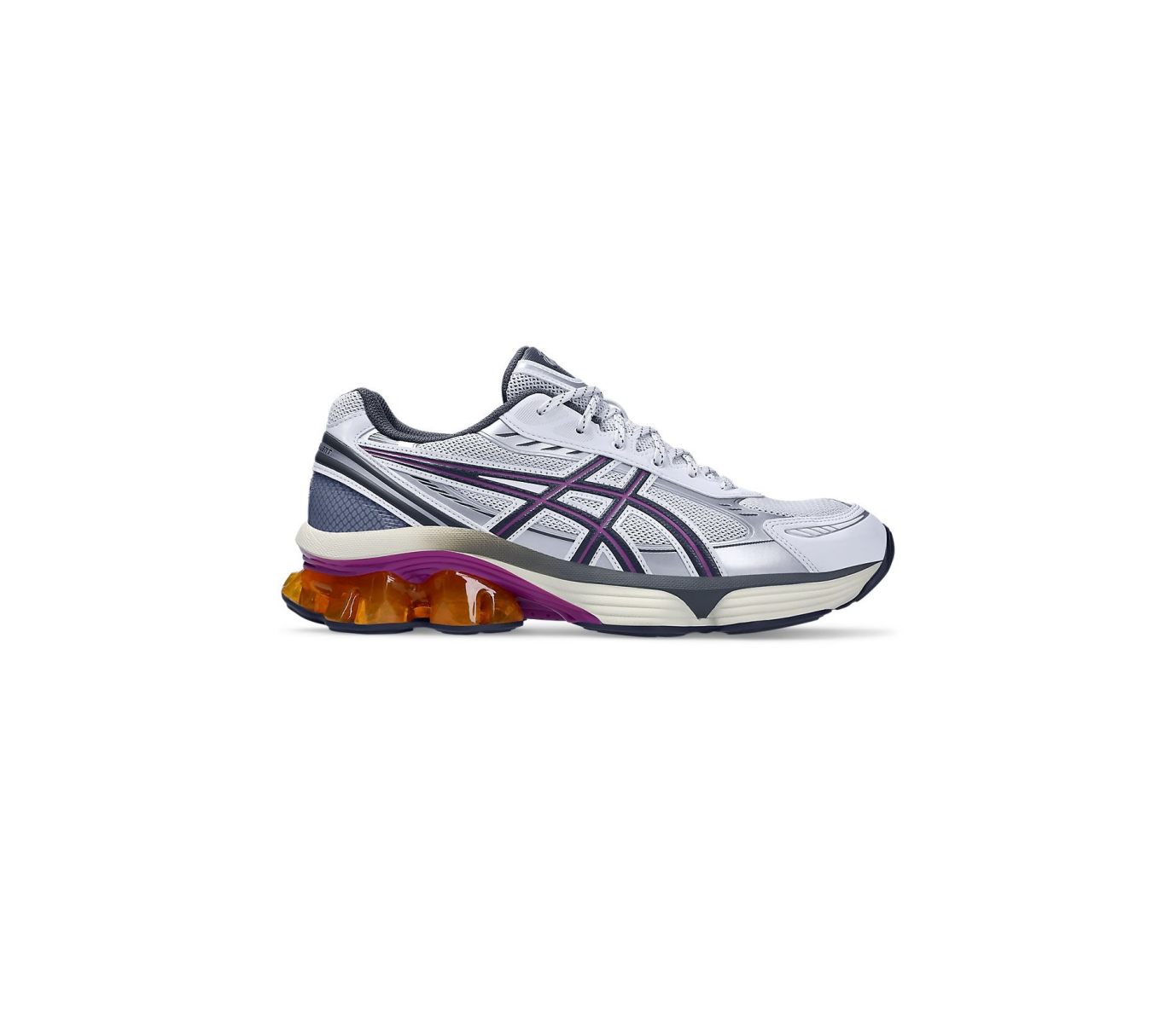 亞瑟士這雙Gel-Kinetic Fluent從2010年代的兩雙復古跑鞋為靈感,設計上延續其運動機能風格,採用科技網布鞋面和彈力中底提升穿著舒適度,銀白與粉紫配色看起來柔美又浪漫,而鞋跟處則大膽融入盾狀橡膠結構,宛如果凍狀的QQ造型格外有種反差萌,也為造型增添吸睛亮點!(售價:NTD 5,980)