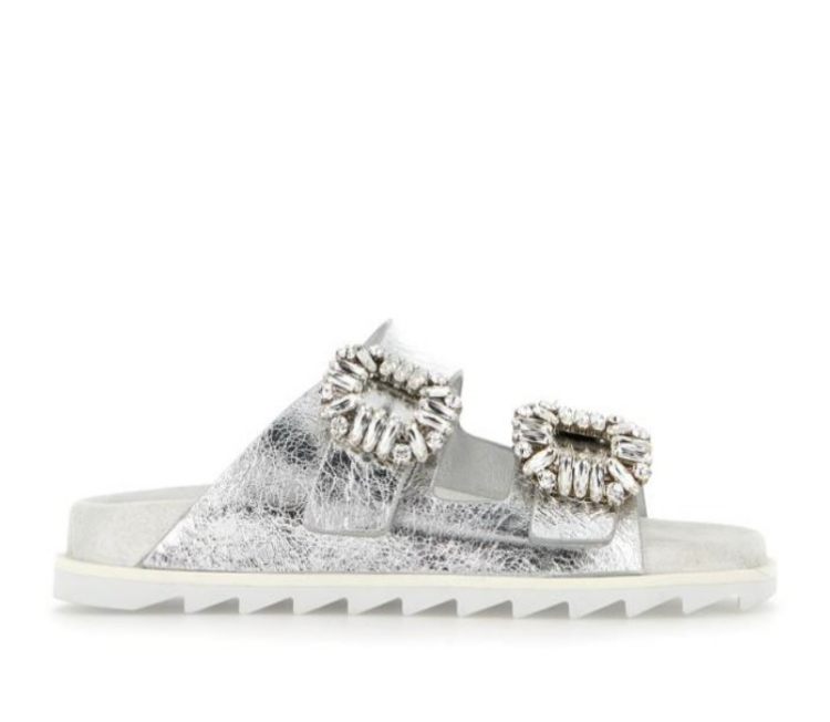 Roger Vivier 2025春夏「方釦鞋」推薦7:銀色山羊皮鑽扣穆勒涼鞋