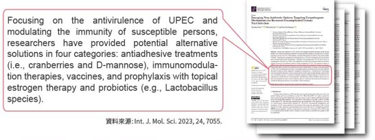 針對女性最困擾的泌尿道感染問題,科學家提出替代抗生素治療泌尿道感染的解決方案,包括抗粘黏治療(蔓越莓+D-甘露糖)、免疫調節治療、疫苗及局部雌激素治療,以及益生菌(如乳桿菌屬)。針對多種致病機制的聯合療法,預計將成為泌尿道感染治療的未來趨勢。婦產科醫師茆盛庭亦指出:「最新國際期刊研究證實,益生菌、蔓越莓、D-甘露糖三管齊下最夠力,私密處保養建議選用的保健品,提供全方位防護,降低感染機率。」