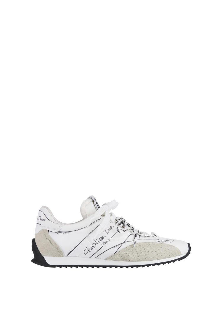運動鞋通常都是以休閒造型來搭配,不過Dior想給妳不一樣的選擇,全白鞋面彷彿一張空白畫布,以黑色筆觸寫上Christian Dior字樣和素描線條,手繪風格為整雙鞋注入一抹藝術氣息,也巧妙減弱了球鞋的運動感,給人一種溫柔知性的氣質,搭配裙裝或是套裝都非常OK!(價格:NTD 35,000)