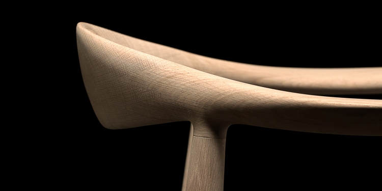 這張椅子以木材構成半圓形框架,平衡於錐形椅腳之上,座椅則由手工編織藤條或皮革製成。其開放式椅背提升了活動的舒適度,優雅的扶手則提供支撐而不占據過多空間。此設計運用 11 塊木料及交錯榫接技法,使扶手至椅背呈現為連續的半圓形,極簡造型卻展現高超木工技藝
