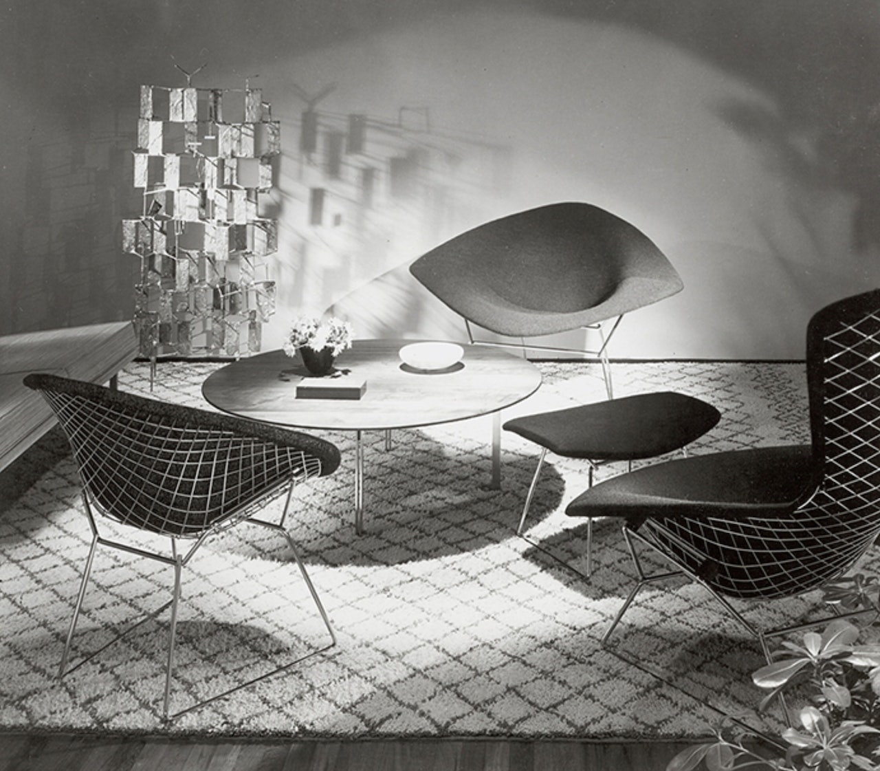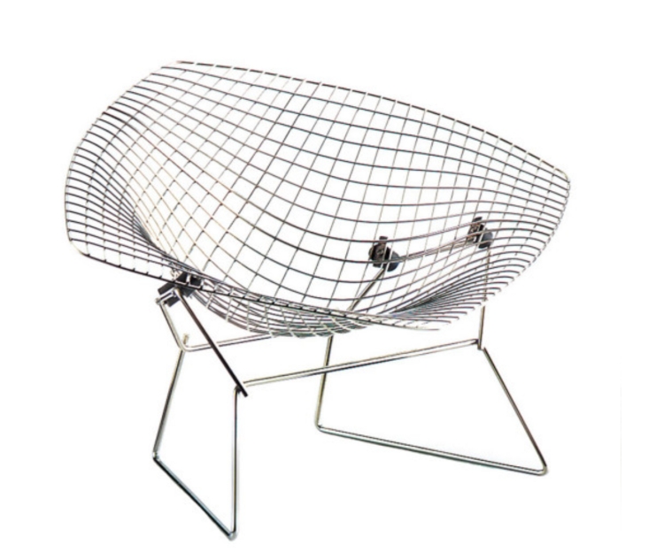 由義大利設計師Harry Bertoia打造的經典鑽石椅「Diamond Chair」,由菱形鏤空的金屬網構成,像一顆鑲嵌在椅座上的鑽石,「這些椅子就像是空氣構成的雕塑,它門各自穿梭其中。」由鋼絲焊接編織而成,拋光金屬椅腳如同戒指的鑲嵌台座,勾勒出輕盈的流動線條。雖然這把Diamond Chair 的省料設計與戰後的資源短缺有關,但也是設計師其個人珠寶設計經驗的展現。