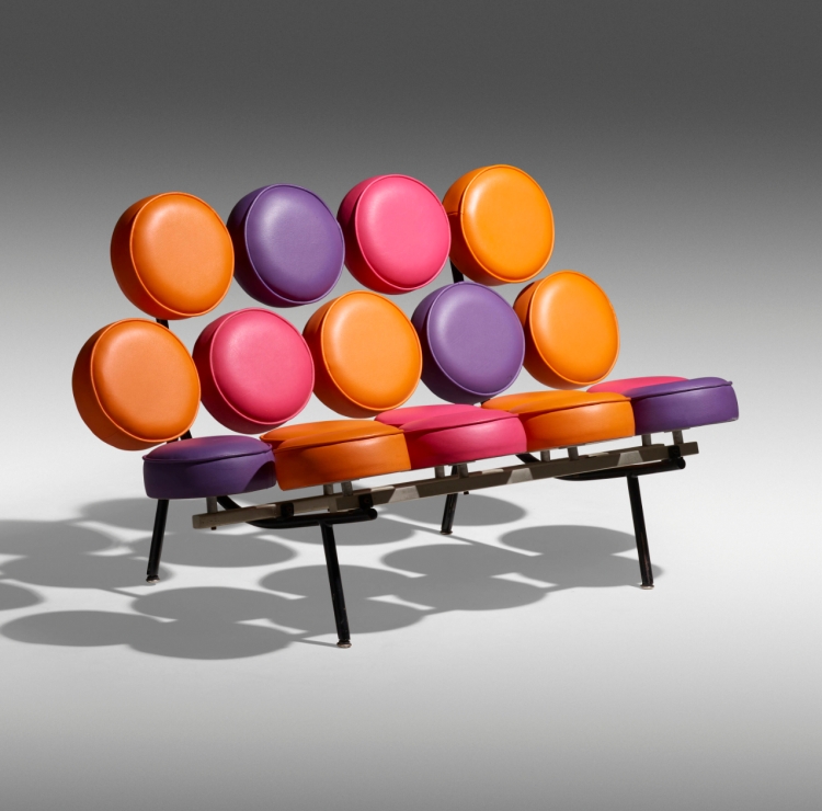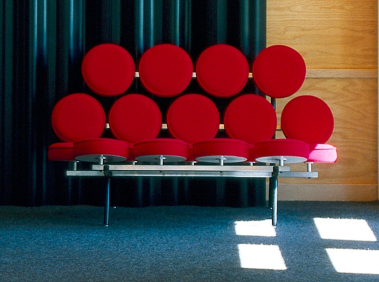 George Nelson於1956年設計的「Marshmallow Sofa」,由 18 個圓形軟墊 組成,均勻排列於金屬框架上,賦予其獨特的模組化與未來感。色彩鮮明,軟墊可自由搭配不同顏色。利用金屬結構支撐柔軟圓墊,顛覆傳統沙發造型,展現 1950 年代的實驗性現代設計精神。相較於傳統厚重沙發,Marshmallow Sofa輕巧靈活,可適應不同空間需求。這款沙發不僅兼具功能與舒適性,更是一件兼具雕塑感的設計藝術。