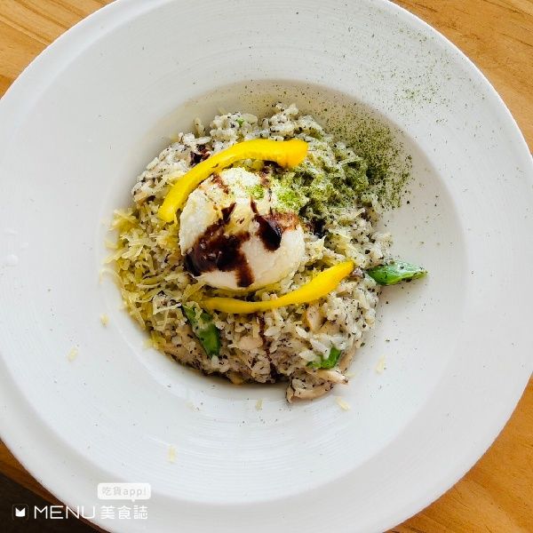 純白的建築外觀,搭配玻璃落地窗,提供沙拉、燉飯、義大利麵、披薩、飲品,推薦松露奶油嫩煎野菇義大利麵、茄汁小戰斧豬燉飯和漁夫的私房家常料理。