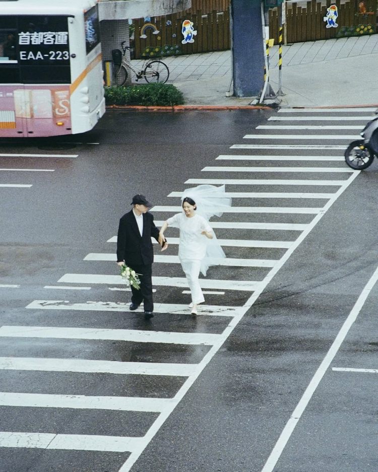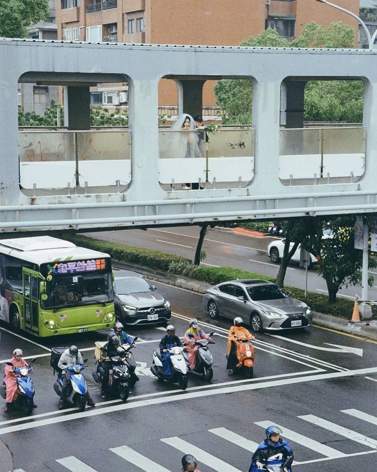 去年年底,韓國獨立天團HYUKOH主唱吳赫與老婆在台北「和平新生天橋」拍攝的一系列婚紗照在社群上爆紅,和平新生天橋擁有四十年歷史,曾是許多電影MV熱門拍攝地。攝影師透過遠景構圖的方式拍攝,他們時而倚靠在天橋欄杆邊,時而穿梭在斑馬線,天橋建築充滿歷史感的老舊痕跡,微涼午後剛下完雨,摩托車和公車穿梭在街道上,形成一幅台北獨有的感性氛圍,兩人的輕婚紗造型簡約又不失典雅,把日常街景拍出不一樣的浪漫,讓許多年輕網友直呼:「這就是我夢想中的婚紗範本!」雖然和平新生天橋目前已拆除,不過利用高低角度巧妙取景的手法值得學習,能為婚紗照帶來更多層次與故事感!